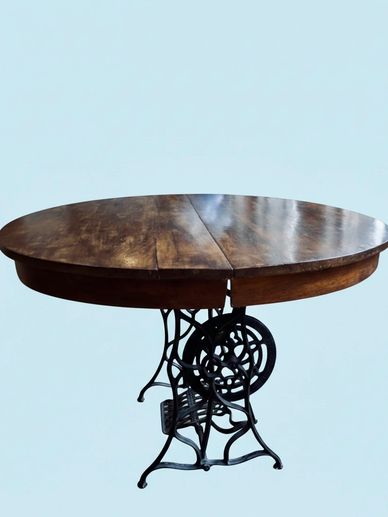 Large unique vintage table featuring authentic sewing machine bottom